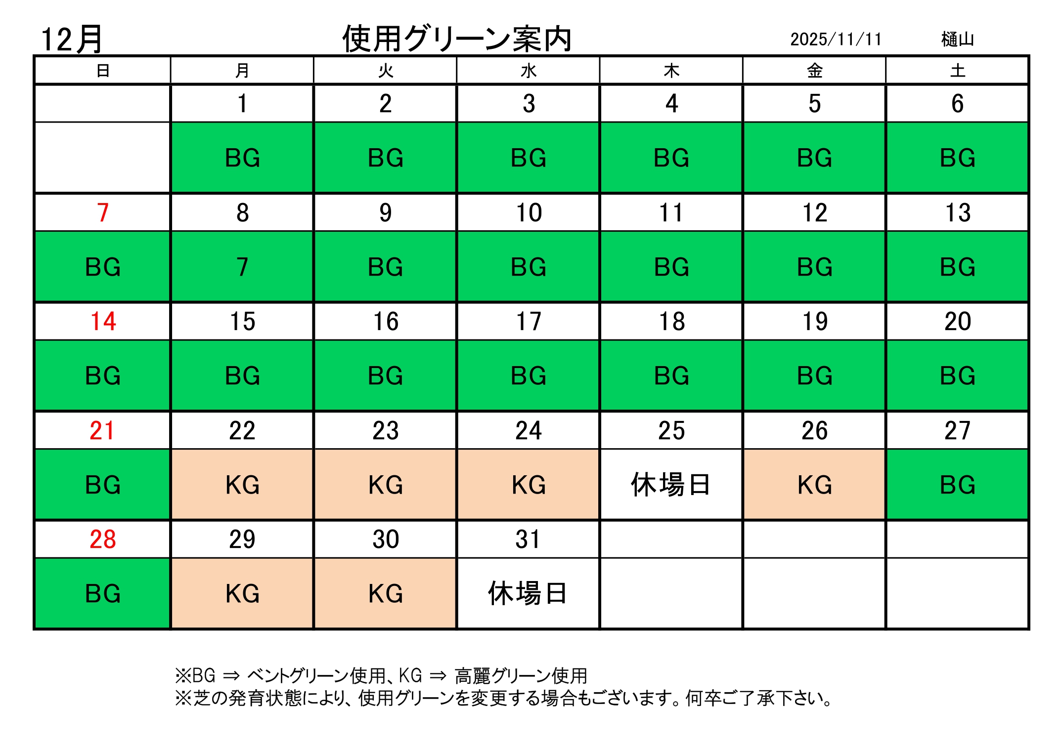 【コース管理より】2025年12月使用グリーン